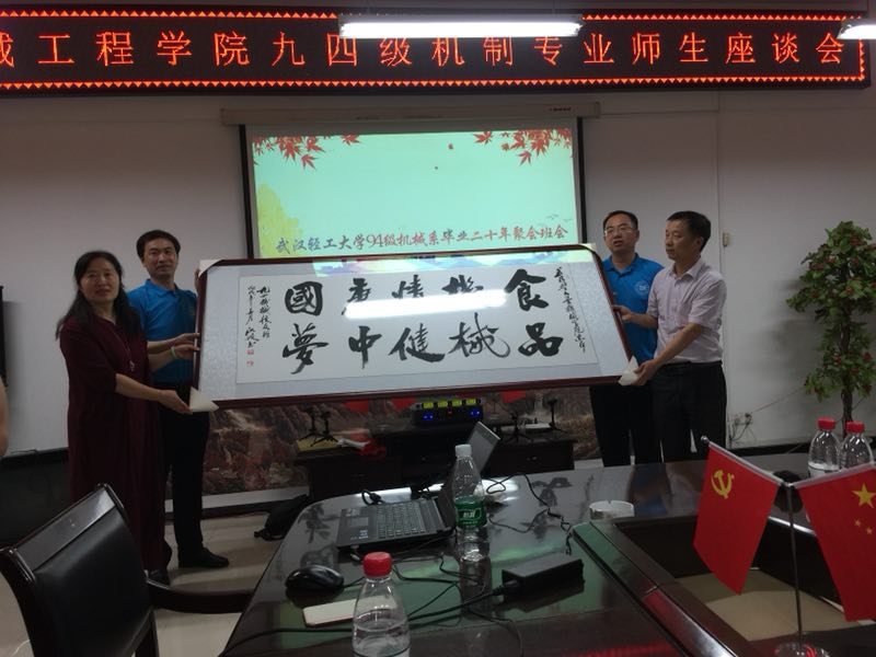 会后,94级员工向公司赠送了“食品机械情 健康中国梦”书法匾额,并在机械大楼前与老师们合影留念。