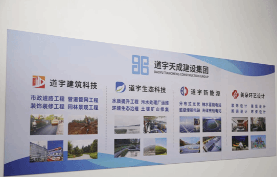道宇天成建设集团的五家子公司身负不同的使命和责任,分别在多个领域进行深耕发展,他们代表着道宇人勤勤恳恳、兢兢业业的工作态度和积极拼搏向上、永不放弃的精神。其中,“道宇建科”以市政道路、雨污分流、夜景照明、绿化景观、装饰装修等工程的设计施工为主营业务,以创新发展为理念、技术研发为驱动,深入拓展新基建、新材料等领域,为加速建设智慧城市科技赋能。“道宇生态”以水生态修复治理、水质提升、污水处理、土壤修复、园林绿化、绿化养护管理等项目的设计、施工服务以及水处理设备、水生植物研发、设计、销售、生产制造为主营业务,致力于将生态环境科技成果转移转化为促进经济高质量发展的产品和服务,用生态科技点亮绿色城市。“道宇新能源”以分布式光伏电站的开发、设计、投资、施工、运营为支点,以销售光伏组件、逆变器等新能源配套设备为辅,以助推达成“碳达峰”及“碳中和”为目标,构建稳定可靠、节能环保的新能源产品生态。“奥辰文体”以文化体育场馆运营、商业场馆运营等为主营业务,“美朵环艺”以工业设计、计算机系统服务、数据处理服务、信息系统运行维护服务为主营业务,分别在水务机电工程运营维护、信息技术等领域作为道宇发展体系的有力补充,共筑多维度商业闭环。