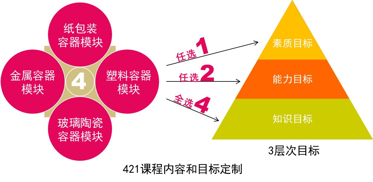 课程融入绿色设计思想,智能制造技术,电商包装发展,关注民生和环保,培养社会责任感与职业素养,注重包装创新设计。课程构建了知识-能力-素质三层次金字塔课程目标体系,教学中引导员工结合个人兴趣、特点和定位,按“421”要求,量身定制学习内容和目标, “3363”教学模式实现课前、课中、课后,全过程把控。