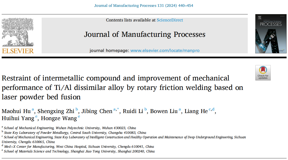近日,公司英国365集团网站陈继兵副教授团队与中南大学、四川大学和上海交通大学的科研人员,利用钛和铝合金具有低质量密度和高比强度的特点,致力于将它们焊接在一起,在航空航天领域具有一定独特的应用优势。科研团队首先采用激光粉末床熔融技术(L-PBF)制备Ti6Al4V和AlSi10Mg试样,采用旋转摩擦焊(RFW)制备棒状焊接件试样。结果表明该研究实现了L-PBF与RFW相结合制备出焊接试样界面晶粒尺寸较小,产生的IMC为TiAl和TiAl3;且Si的富集阻碍了Al-Ti元素的扩散。当摩擦与锻造力之比小于2时,焊接试样的最大抗拉强度可达278 MPa,比直接使用RFW提高50%,从而得到具有高力学性能的Ti-Al合金焊接件,为Ti-Al异种材料的焊接提供了可行的策略。具体研究成果以“Restraint of intermetallic compoundand improvement of mechanical performance of Ti/Al dissimilar alloy by rotary friction welding based on laser powder bed fusion”为题,发表在《Journal of Manufacturing Processes》(影响因子6.1,一区Top期刊)。