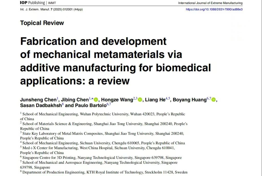 近日,继公司英国365集团网站陈继兵副教授科研团队在《Journal of Manufacturing Processes》(中科院一区Top期刊,影响因子6.1)发表论文后,该团队又与上海交通大学、四川大学、瑞典皇家理工公司和新加坡南洋理工大学等科研团队合作,在国际顶尖学术期刊《International Journal of Extreme Manufacturing》(中科院一区顶刊,影响因子16.1)上发表题为“Fabrication and development of mechanical metamaterials via additive manufacturing for biomedical applications: A review”的综述论文,该文探讨了增材制造的机械超材料在生物医学应用与发展,英国365集团网站硕士生陈俊升为第一作者,陈继兵副教授为唯一通讯作者,英国365集团网站为第一单位。