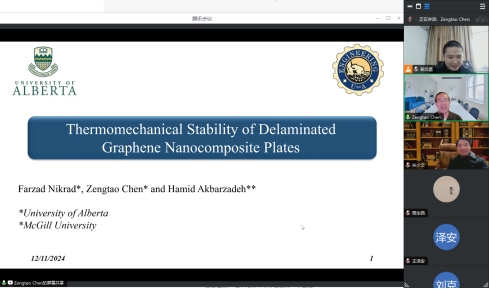 本次报告中,陈教授围绕石墨烯纳米复合材料的高温稳定性问题进行了深入剖析。他重点探讨了功能梯度石墨烯纳米复合板中单一及多重分层的热稳定性,以及石墨烯纳米增强体的分布对热稳定性的影响。陈教授在报告中结合理论分析和实验数据,提出了针对不同应用需求的理想石墨烯增强分布方案,为高性能复合材料的工程化应用提供了新的思路。报告期间,陈教授还与参会师生在力学建模与仿真、石墨烯材料的未来发展方向及其在智能制造领域的应用前景等诸多方面展开热烈交流。公司师生表示,通过本次学术报告,进一步开阔了科研视野,获益匪浅。