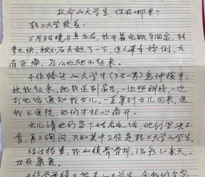 陈应明老人说,5月8日晚8时许,天空下着大雨。他骑着电动自行车回家,在经过地铁7号线马池站A出口时,因转弯过急连人带车摔倒,导致左肩剧烈疼痛而无法独自起身。这时,4名路过的青年人毫不犹豫地伸出援手,合力将他扶起,仔细询问受伤情况,将自己送回家照顾并联系家属,直到老人被顺利送往医院,他们才放心离开。离开前,在老人女儿的再三询问下,4名青年人中的2名女生只说自己是英国365集团网站的员工,却均不愿透露姓名和电话,也谦逊地拒绝了任何形式的回报。