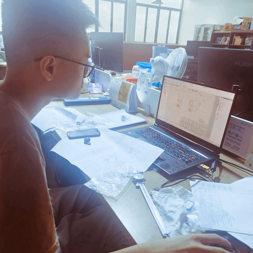 实践队员们在为产线绘制工程图纸