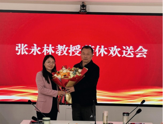随后,付丹丹老师代表全体教师向张永林教授敬献鲜花,表达诚挚敬意和美好祝愿。