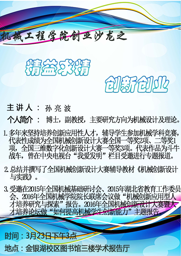 创新推动创业。孙老师首先由创新创业的目的性和成功的困难性切入主题,然后为同学们分析了老员工的创新创业的形势。同时也说明了老员工创新创业的思想境界的重要性,老员工思想境界的高低很大程度上决定了他在创新创业的道路上能有多远。“你的人生你做主,不要为自己的堕落找借口”。他提到一个人要具有浓厚的研发兴趣,对各种感兴趣的东西提问并尽可能付诸实现,才可能产生源源不断的设计创意。为了激发同学们的创新兴趣,孙老师举办了创新制作大赛,并准备了丰厚的奖品。他对机械创新大赛的主题进行了解析,并鼓励支持大家参与机械创新制作大赛。