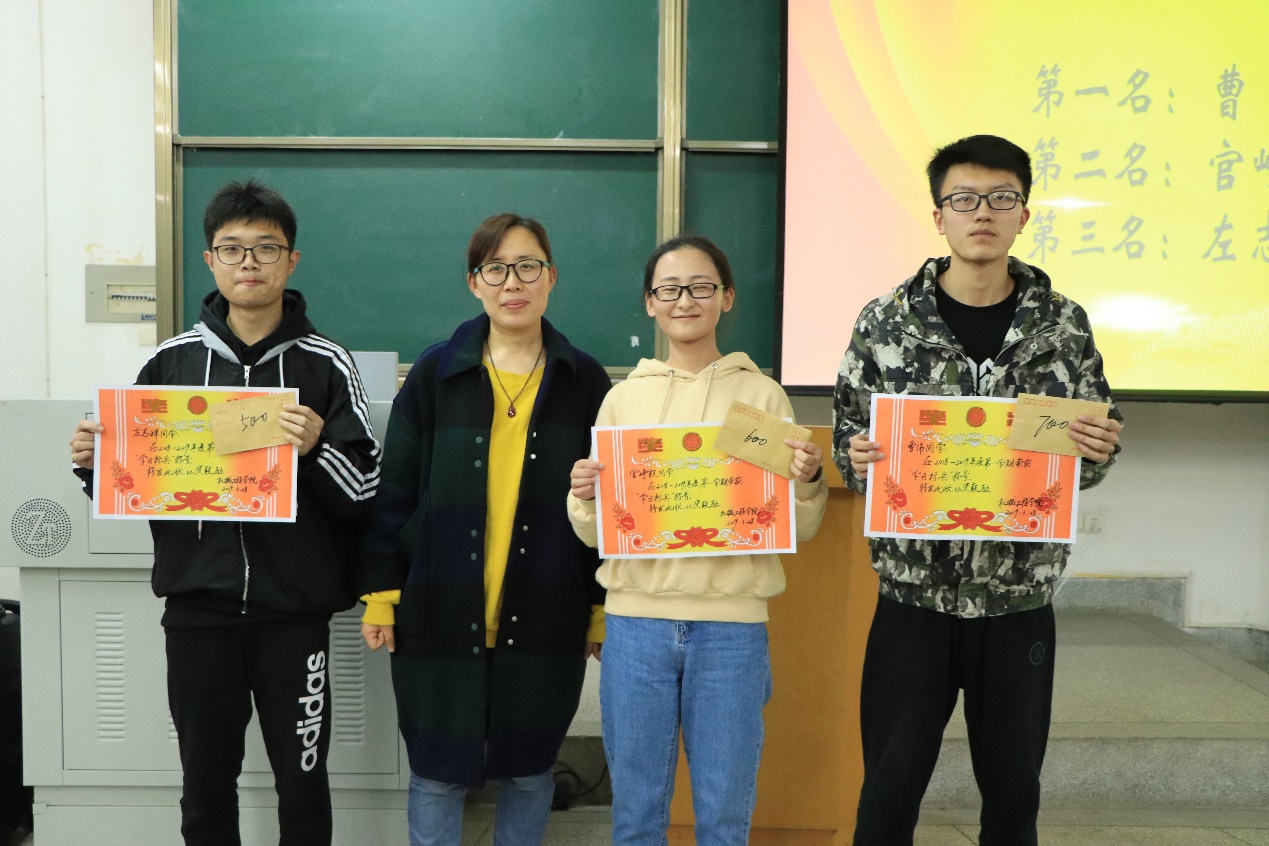 大会对上学期表现优秀的个人和班级进行了表彰。、曹伟、官峥颖、左志祥三名同学分别获得年级前三名的好成绩。机械1807班,包装一班,包装二班分别获得集体前三名。辅导员康老师对于这些优秀员工个人和集体所付出的辛苦付出给予了充分肯定,并代表公司给以上班级和个人颁发奖学金。员工代表曹伟、官峥颖、董明奎就自己的学习经验进行了交流,他们一致认为:要想取得好成绩,首先要养成好习惯,同时还要有认真钻研的求实精神。