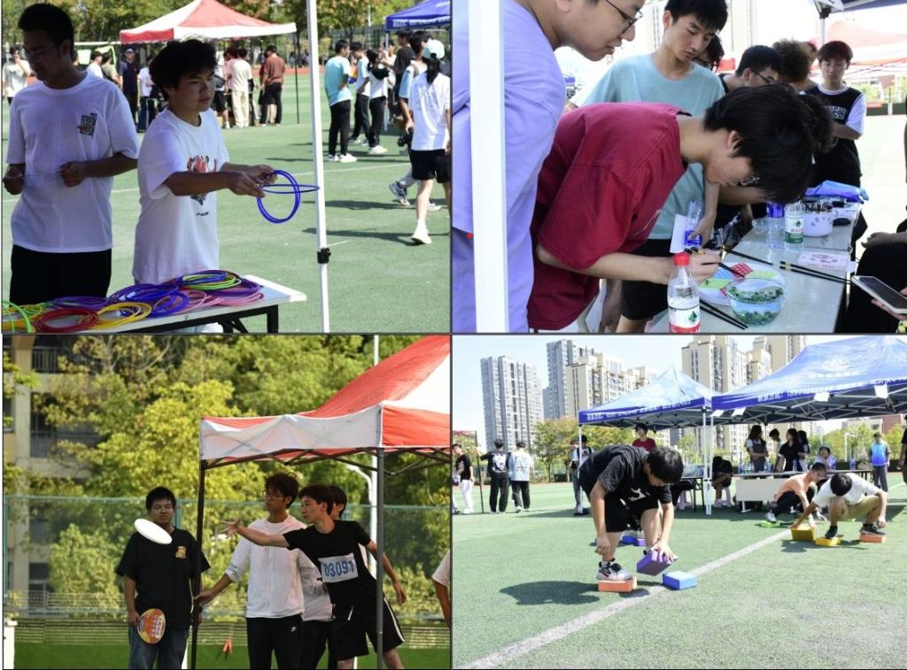 在田径场中央,组委会还另设有摸石过河、海底捞月、游戏飞盘、投壶、保龄球、套圈等六个趣味运动项目,让同学们在运动之余放松心情。赛场上不止有竞技的紧张激烈,更多了一份愉快与惬意。