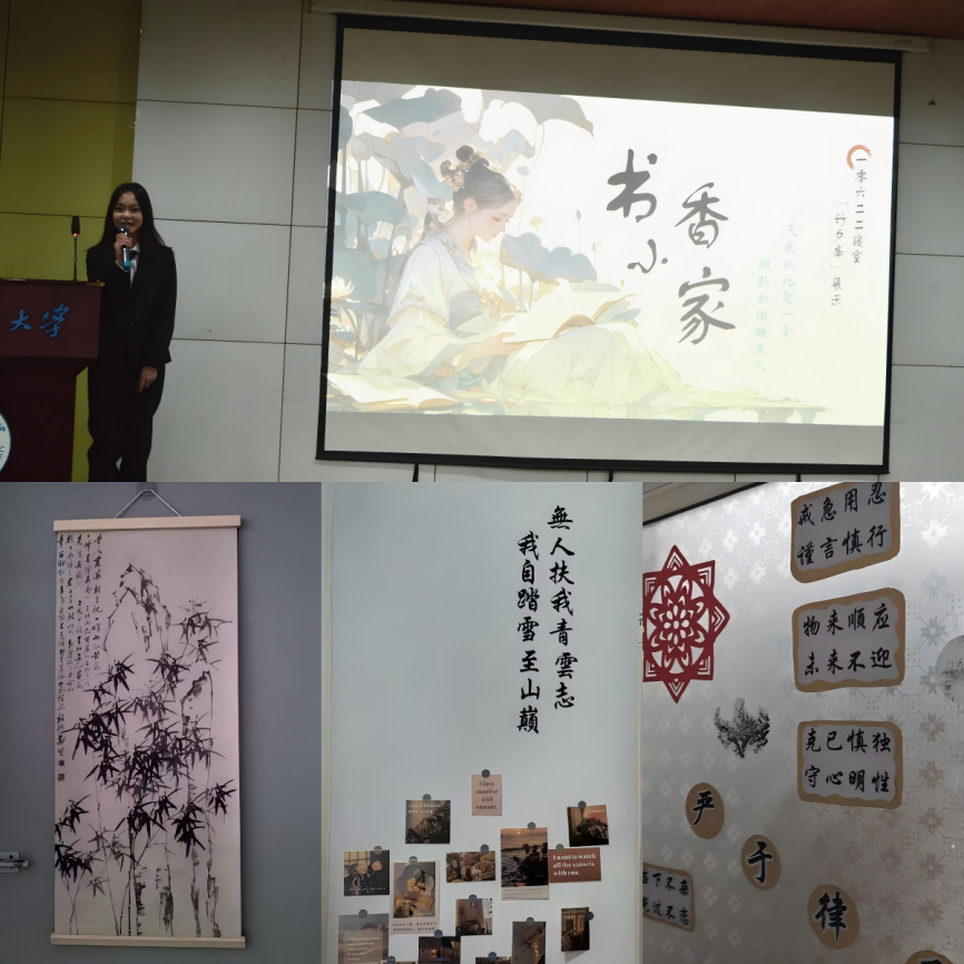 正是少年读书时,书似清风润心田。参赛寝室主讲人通过PPT全面展示了寝室成员精神风貌与独具匠心的寝室布置,结合生动有趣的视频,充分展现了各寝室的独特风采和文化特色。泼墨书法、精彩诗画、读书品茗、印章雕刻......一个个别出心裁的设计,向同学们展现了“书香小家”最为深刻的内涵:寝室风采展示并不是简单的装饰,更是热爱知识与生活的态度。