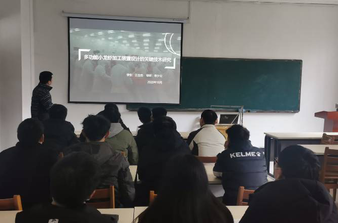 研究生江立杰汇报的是硕士论文的研究工作——多功能小龙虾加工装置设计的关键技术研究。该加工装置具有装夹,去头,开背,刷腹,去肠等功能,非常具有创新性。汇报结束后,团队老师就研究方法和实验方法进行了具体指导。
