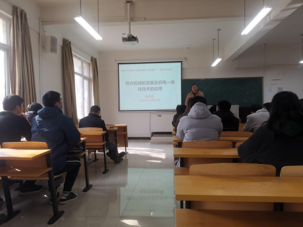 杨红军老师报告的题目是:粮仓机械的发展及机电一体化技术的应用。杨老师首先介绍了与粮仓机械相关的研究内容,之后进一步介绍了机电一体技术的应用,为后期将粮仓机械和机电一体化相融合的研究方向提供了思路。