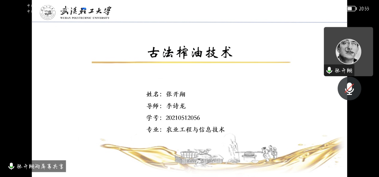 张开翔同学以“古法榨油技术”作专题汇报。从传统榨油技法、传统榨油机地域分布等作了概述,对传统榨油技法的演变规律、传统压榨设备等方面进行了详细分析。针对汇报内容,李诗龙教授从压榨技法演变、传统设备受力分析等方面给予指导,王旺平老师、万志华老师、严清华老师对汇报内容表示肯定,并对其下一步的研究计划提出了建议。