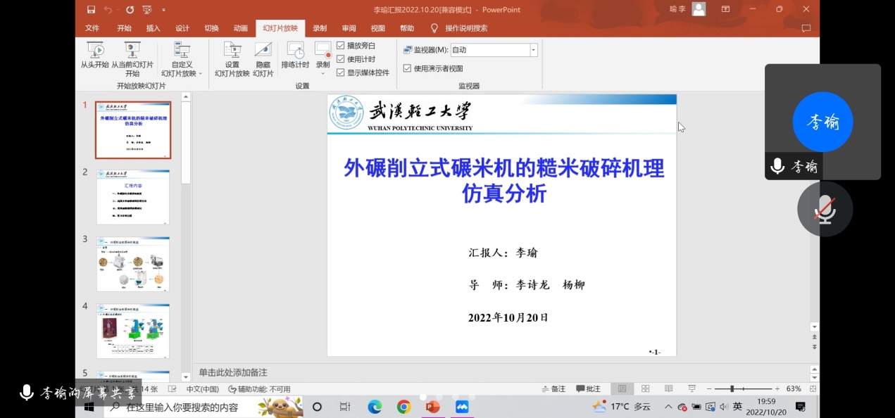首先,李瑜同学以“外碾削立式碾米机的糙米破碎机理仿真分析”做专题汇报。从外碾削立式碾米机概述、离散元中颗粒破碎模拟方法、糙米颗粒物理参数测定等多方面做了介绍,并对进一步优化仿真模拟做了学习计划。针对汇报内容,王旺平老师对其实验模拟过程给出建议,万志华老师、张恒老师、张敏老师等对其选用的模拟软件表示肯定,并依据自己的研究方向,就如何优化模拟仿真提出了宝贵意见。