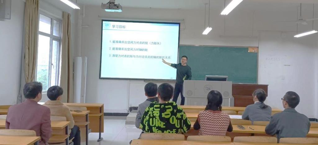 魏国粱博士选取力矩矢内容,按照青年教师讲课比赛要求,进行了15分钟课堂讲授,内容熟练,条理清晰,融合了一定的课程思政案例。课后各位老师对给出了充分的肯定,也对选题给出了中肯的建议,邀请现场指导的严清华老师,更是根据自己多年《理论力学》课程教学经验,结合教学比赛要求,针对不同选题的优缺点进行了比较分析,分享了大量的课程思政案例。