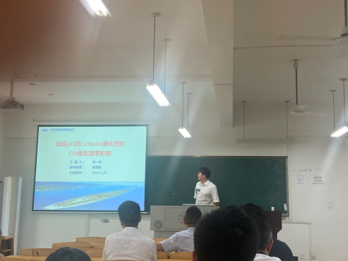范一权同学以“反应pH对CeMnOx催化剂的CO催化效率影响”为主题进行专题汇报。从研究思路、前驱体分析、催化性能评估以及物化性能评价进行了介绍,并与与会老师进行了充分的交流。