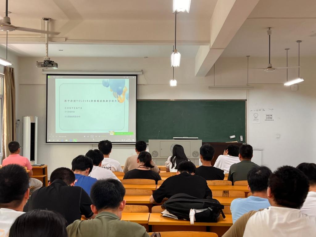 吴文龙汇报主题为“基于改进YOLOv8s的草莓成熟度分级方法”,介绍了具体对YOLOv8算法改进的措施,并通过收敛性分析、消融实验和对比实验发现,改进后的模型平均精度值超过原模型并趋于收敛。