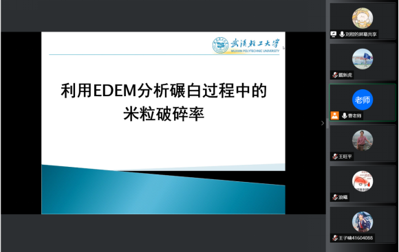 刘程同学进行了“利用EDEM分析碾白过程中的米粒破碎率”的专题汇报,介绍了米粒的基本物理特性、实验中所采用的实验方法、米粒模型的简化方法以及实验的仿真过程,从多个方面介绍了研究的进展。针对汇报内容,王旺平副教授、万志华老师、江文凯老师、杨柳老师等对PPT的展示与汇报技巧、模型建立依据、仿真参数的表征等方面提出了中肯的建议。