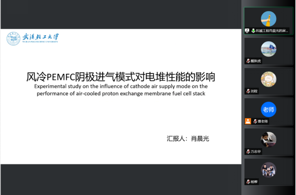 肖晨光同学报告内容为“风冷PEMFC阴极进气模式对电堆性能的影响”。他首先介绍了风冷电堆的意义,随后讲述了风冷电堆的实验设计与实验方法,展示了电压均一性与温度均一性实验的结果,介绍了不同阴极进气策略下电池温度分布以及阴极进气模式在不同环境温度下对电堆的影响,最后对研究内容进行了总结。王旺平副教授、裴后昌副教授、张恒老师等对于汇报的思路、实验结论的表述提出了建议。
