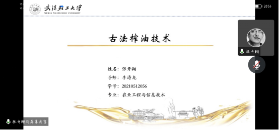 张开翔同学以“古法榨油技术”作专题汇报。从传统榨油技法、传统榨油机地域分布等作了概述,对传统榨油技法的演变规律、传统压榨设备等方面进行了详细分析。针对汇报内容,李诗龙教授从压榨技法演变、传统设备受力分析等方面给予指导,王旺平老师、万志华老师、严清华老师对汇报内容表示肯定,并对其下一步的研究计划提出了建议。