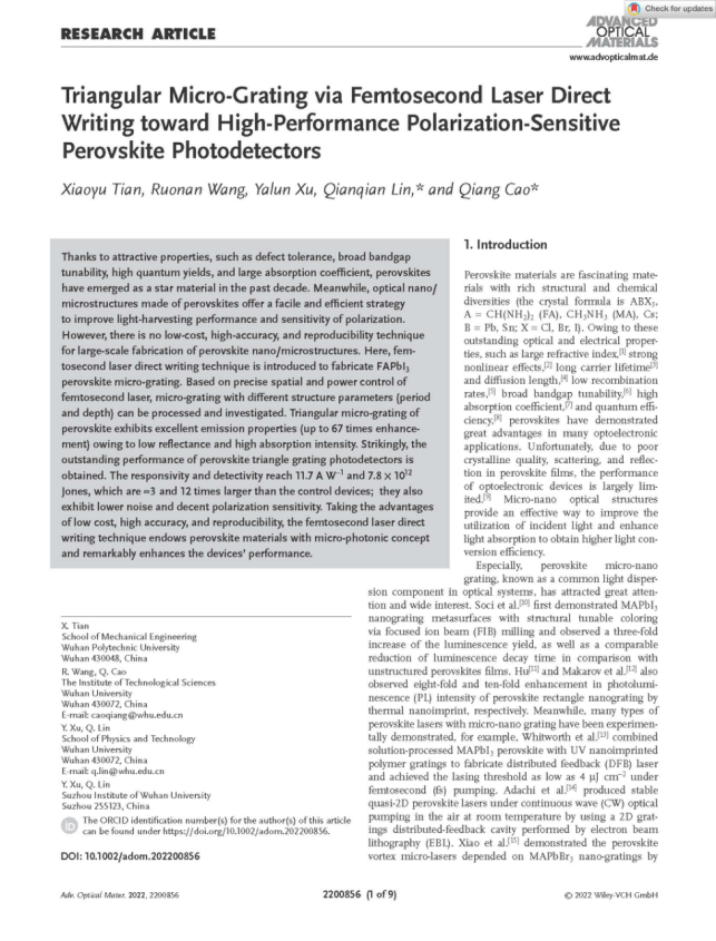 近期,公司新能源团队青年教师田晓语作为第一作者,英国365集团网站为第一通讯单位,在国际知名光学材料期刊《Advanced Optical Materials》(1区期刊,影响因子10.05)发表题为“Triangular Micro-Grating via Femtosecond Laser Direct Writing toward High-Performance Polarization-Sensitive Perovskite Photodetectors”学术论文。该成果的合作者包括武汉大学工业科学研究院曹强研究员、物理科学与技术公司林乾乾教授。