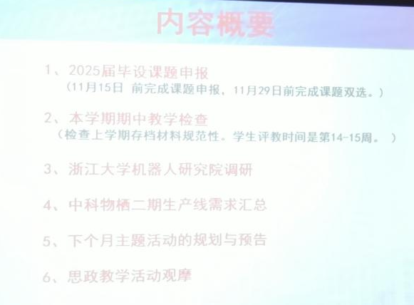 会议伊始,尹强老师对2025届毕设课题申报工作进行安排,课题宜从机械结构设计、硬件设计、软件设计等方面选题;对本学期期中教学检查要求进行说明,提醒各位老师需注意检查上学期存档材料的规范性,同时关注本学期员工评教的时间;会上介绍了浙江大学机器人公司调研的情况,探讨在浙江大学机器人公司进行生产实习、毕业实习的可行性;讨论了中科物栖二期生产线当前项目进展,强调各老师提出的软硬件设备要与课程或毕业设计相关,确保设备的使用率。