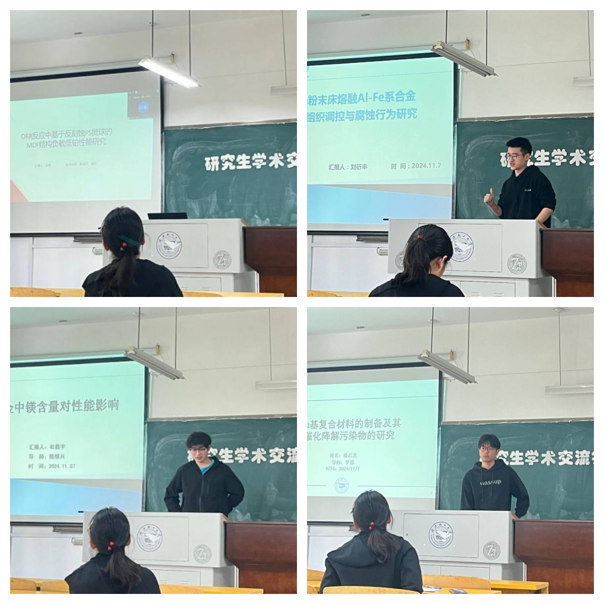 会议开始后,2023级硕士生佘勇就“ORR反应中基于反刻蚀ps微球的MOF结构负载低铂性能研究”学习进行线上汇报;接着,2023级研究生刘衍丰分享了关于“激光粉末床熔融AI-Fe系合金显微组织调控与腐蚀行为研究”的实验成果;然后,2023级硕士生杜鑫宇对近期学习情况进行汇报,并就“铝合金中镁含量对性能影响”进行讨论;最后,2023级硕士生潘志龙分享了“SnO2基复合材料的制备及其光催化降解污染物的研究”的实验结果。
