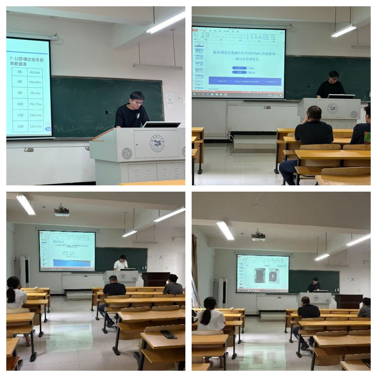 会上,秦朗汇报“某车型轮毂结构轻量化设计”,用SolidWorks建模并导入Ansys进行多种试验,定位应力集中区后优化轮辋结构并做模态分析,研究具有很强的工程意义。刘浩分享“振动和摆放角度耦合作用对电池性能的影响”,发现水平摆放利于水定向迁移、改善电池水管理问题,指出振动影响运行稳定性,指导老师建议量化振动对EIS测试的干扰。李琪介绍“压力波动扰动下死端质子交换膜燃料电池电流密度演变特性及机理”,通过电磁阀模拟压力波动,用PCB板记录电流密度分布,发现阳极压力突降可缓解反极、提升性能。冷俊林汇报“预开孔海冰在结构低速冲击下的破坏机理研究”,结合内聚力模型仿真,构建冲击模型模拟冰体破碎,还介绍了透明冰体材料制备方法及后续优化方向。