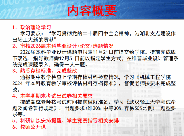 会议伊始,全体与会教师进行了政治理论学习,聚焦“学习贯彻党的二十届四中全会精神,为湖北支点建设作出轻工大新的贡献”。随后,尹强主任就2026届本科毕业设计(论文)选题工作作出具体安排,提醒各位教师及时完成线下双选及课题系统录入,并强调需熟悉毕业设计存档规范、按时完成相关整改工作。此外,他还对本学期期末考试命题、科研训练安排以及员工竞赛指导等事项作了进一步提醒与部署。