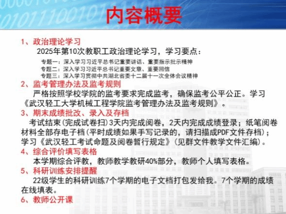 会议首先开展了十二月份政治理论学习,全体教师围绕“深入学习习近平总书记重要讲话、重要指示批示精神”和“深入学习贯彻中共湖北省委十二届十一次全体会议精神”进行了集中学习,全面领会了习近平总书记对高等教育改革和发展的战略部署,并深刻把握了省委全会对我省发展的具体要求。随后,尹强主任对2026届本科毕业设计(论文)相关工作进行了系统部署,重点就开题报告与外文翻译任务提出具体要求,强调指导教师要加强过程管理,督促员工按节点高质量完成相关材料。同时,他提醒全体教师认真对照毕业设计存档规范,按时完成整改与归档工作。此外,会议还对本学期期末考试监考安排及科研训练项目材料存档等事项作出了进一步说明和安排。