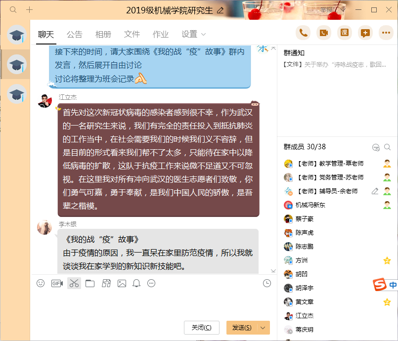 “支援武汉的医生志愿者们,勇气可嘉,勇于奉献,是我们中国人民的骄傲,是吾辈之楷模。”2019级江立杰说。2018级党员王选说:“相信我们每一位党员在这次疫情中把工作做到实处,同群众上下团结一心,共同克服这次疫情,让社会恢复往日秩序,展现我们中国风采。2017级研究生何倩倩则结合最近关注的新闻信息和自己家庭的情况分享了所思所悟,并表示将抓紧毕业论文的写作,与导师定期讨论沟通,同时关注网上招聘,积极投递简历,争取线上面试机会。