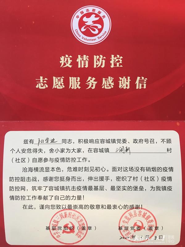 3月18日,监利县容城镇三闾新村“解封”,社区副书记第一时间上门将一封《疫情防控志愿服务感谢信》送到阳学进手中,感谢他挺身而出,伸出援手,为当地疫情防控贡献力量。